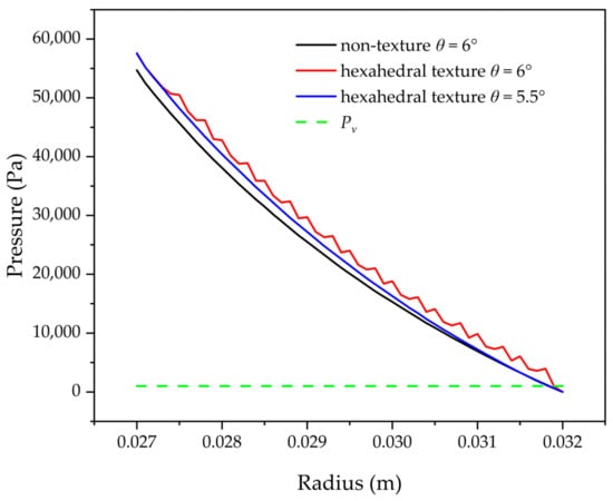 Figure 26 depicts the radial distribution of oil pressure on the upper surface of oil film, with overall pressure decreasing along the radial direction; θ = 6° is in the texture region, and the oil flow through the texture dimple causes a significant pressure pulsation, where θ = 5.5° is in the non-texture region, and the pressure curve is relatively smooth. As a consequence, pressure turbulence caused by the weaving structure is the primary cause of cavitation.