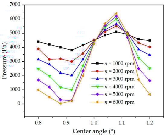 Conversely, whether cavitation affects pressure requires further investigation. To statistically measure the pressure distribution inside a single texture, we ran simulations under two conditions: one considering the cavitation effect and one disregarding the cavitation effect [,]. Figure 27 depicts the pressure distribution inside a single texture dimple at various rotational speeds while accounting for cavitation effect (0.9–1.1° for the texture region, 0.8–0.9° and 1.1–1.2° for the non-texture region). The oil is strongly squeezed near the texture root due to the strong shearing effect and barrier effect in dimple, resulting in a significant decrease in the low-pressure value and a significant increase in the high-pressure value.