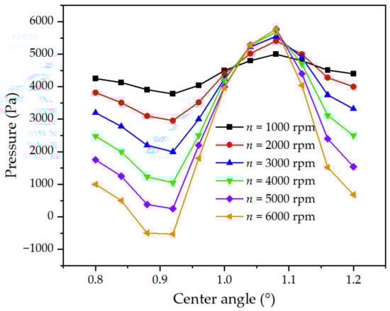 Pressure distribution in texture dimple with cavitation effect at different rotational speeds.