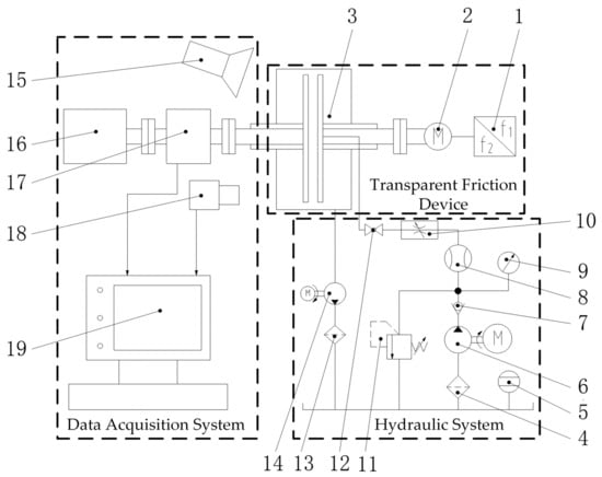 The design of a single pair of friction pair visualization test systems, the principle of which is shown in Figure 29, consists of three parts: transparent friction device, hydraulic system, and data acquisition system to verify the validity of the theoretical analysis in practical engineering applications.