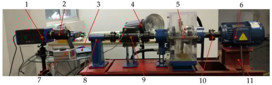Transparent test platform (1 = high-speed camera; 2 = lens; 3 = computer; 4 = fill light; 5 = host; 6 = motor; 7 = data collection unit; 8 = magnet powder brake; 9 = torque sensor; 10 = coupling; 11 = base).