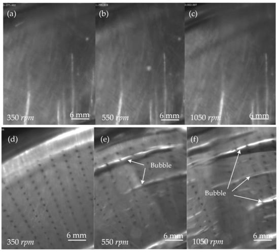 Following that, the non-texture friction disk was replaced with a 6% texture friction disk, and as shown in Figure 32d, there were no cavitation bubbles at 350 rpm, indicating that there was no cavitation at low speed. As shown in Figure 32e, cavitation bubbles appeared first at the outer diameter at 550 rpm. As shown in Figure 32f, multiple narrow cavitation bubbles appeared in the view field at 1050 rpm, indicating.