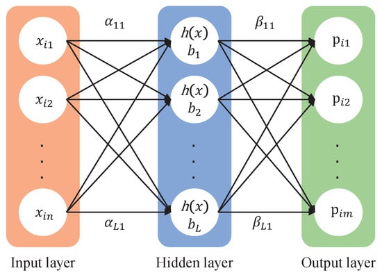 The extreme learning machine was first proposed in 2004 by Huang et al. []. During the training of traditional feedforward neural networks, which uses the gradient descent algorithm, its parameters tend to be the optimal solution in the update and calculation of each iteration []. However, the traditional feedforward neural network has many shortcomings, such as slow learning speed and complex network architecture. Therefore, the original intention of the extreme learning machine is to overcome these problems. ELM is regarded as a special kind of FNN in research or an improvement of FNN and its backward propagation algorithm []. The ELM architecture is divided into three layers, the input layer, the hidden layer, and the output layer, as shown in Figure 1. Different from the traditional feedforward neural network, the hidden layer of the extreme learning machine has only one layer. It is a single-layer feedforward neural network algorithm; its characteristic is that the input weights and biases of the hidden layer nodes are randomly generated or artificially given []. The learning process only needs to calculate the output weight through two; this feature has long meant that it has a faster learning speed and higher generalizability, as well as a strong learning and fitting ability.