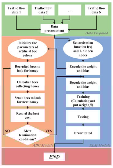 In this paper, we develop a short-term traffic flow forecasting model called ABC-ELM, employing the artificial bee colony (ABC) algorithm model embedded into the ELM model. The ELM was first proposed in 2004 by Huang et al. []. In the ELM model, during initialization the generation of input weights and hidden layer deviations are random; then, the excitation function is calculated through the input data. The Moore–Penrose (MP) generalized calculation inverse calculates the output matrix weights []. This characteristic not only makes it much faster than traditional learning models, but also avoids problems in traditional learning models, such as falling into a local optimum, learning rate too large or too small, etc. []. However, it also has drawbacks as it is randomly determined that the prediction accuracy of the destined ELM will not be particularly good, and there is an overfitting problem. To solve this problem, we propose embedding and incorporating the ABC algorithm model in the ELM. The ABC algorithm selects the optimal parameters in the process of random parameter determination in the ELM. Currently, ABC is mostly used to optimize training neural networks, such as the hybrid algorithm Ozturk et al. proposed in [], which combines -the ABC algorithm and the Levenberg-Marquardt (LM) algorithm, after which the hybrid algorithm is used to train an ANN. In this way, based on the experimental results of predecessors, we do not need to increase or delete the parameters of ABC-ELM to improve the accuracy of the model and at the same time prevent the overfitting problem caused by too many parameters. The main contributions of the ABC-ELM model proposed in this paper for short-term traffic flow forecasting include the following points: