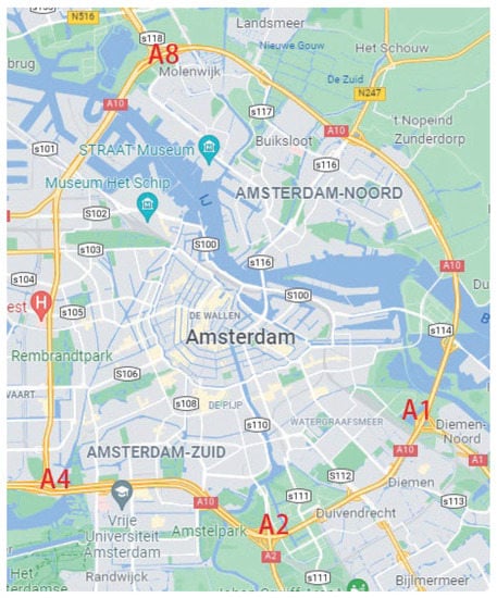 In this section, the training data come from the four intersections of the A10 roundabout in Amsterdam, namely A1, A2, A4, and A8, which enter the roundabout. These data are collected at these four points of interest (i.e., the four entry points) via roadside units and uploaded to the traffic control center in real time [].