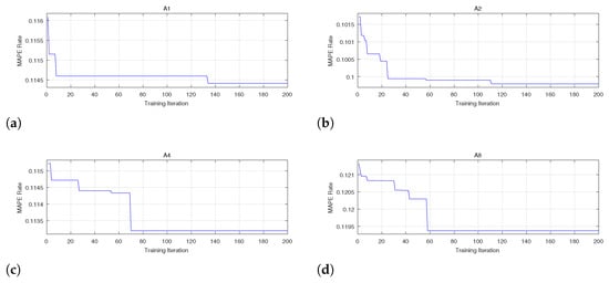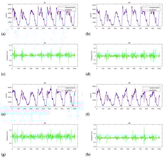 Figure 6a–h represent the forecasting–measurement value comparison plots and the forecasting–measurement value relative error of the ABC-ELM model under four training sets A1, A2, A4, and A8, respectively. Where Figure 6a,b,e,f represent the forecasting–measurement value comparison plots of ABC-ELM, the blue line represents the forecasting, and the red line represents the measurement. As can be seen from the figure, the ABC-ELM model performs well in the traffic flow forecasting model, and the predicted results are almost consistent with the actual results. However, there are still shortcomings, especially when the traffic flow changes dramatically in a short period. Figure 6c,d,g,h represent the forecasting–measurement relative error of ABC-ELM. Its calculation formula can be expressed as: