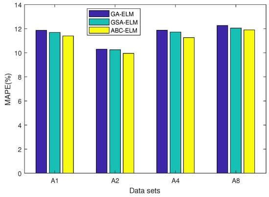 Comparison of MAPE values of three learning models GA-ELM, GSA-ELM, and ABC-ELM. ABC-ELM has the lowest MAPE values in all four datasets A1, A2, A4, and A8.