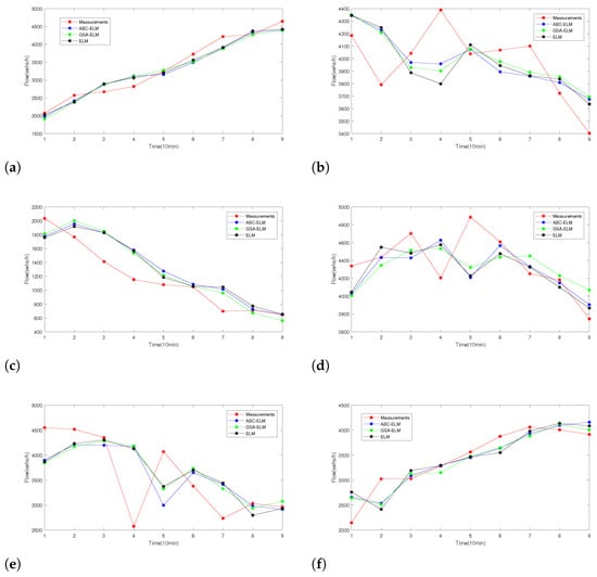 Finally, Figure 7a–f represent the partial comparison of predicted values for each learning model in different cases. Since we are taking nine elements as input feature values, the predicted value segments obtained here are also nine moments. It represents the traffic flow values for the first ten-minute moment, the traffic flow values for the second ten-minute moment, and so on. The red line represents the actual value, the blue line represents the predicted value from the ABC-ELM model, the green line represents the predicted value from the GSA-ELM model, and the black line represents the predicted value from the ELM model.