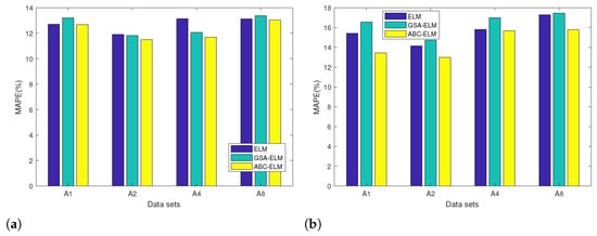 We also compare traditional ELM and the improved optimization models based on the traditional ELM, including the GA-ELM model and GSA-ELM []. As shown in Figure 5, it is clear that the ABC-ELM model outperforms the GSA-ELM in all four MAPE evaluation criteria with the same dataset, and ABC-ELM still matches the performance of GSA-ELM in the RMSE evaluation criteria. In addition, we also compared the Akaike information criterion (AIC) values of traditional ELM, GA-ELM, GSA-ELM, and ABC-ELM for the four datasets, which is a measure of the goodness of fit of statistical models. As shown in Table 5, the ABC-ELM model has lower AIC values compared to the GA-ELM model and GSA-ELM model for the same dataset. Therefore, we believe that the ABC-ELM has better forecasting accuracy.