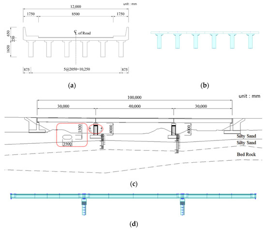 As shown in Figure 10a,c, the PSC I-girder bridge used in this study has three spans, where each span has a width of 12 m and a total length of 100 m, and the maximum inter-span distance is 40 m. The FE bridge model is detailed in Figure 10b,d,e. The FE model for I-girders, beams, and piers was built using beam elements, and the number of beam elements used was 331. Details of material constitutive models used for the I-girders, beams, and piers are shown in Table 2. The boundary conditions of the FE model are fixed at the abutment and the bottoms of the piers. Furthermore, in order to consider the bridge shoes installed at the connection of the bridge deck and the pier cap, the bridge deck and the pier cap were connected with a spring element.
