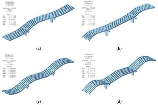 The dynamic properties of the bridge were investigated by performing an eigenvalue analysis, and the results are shown in Figure 11 and Table 3. Figure 11c,e show the mode shapes of natural frequencies of 3.215 Hz and 5.428 Hz in the bridge’s x-direction. Figure 11a,b show the mode shapes of natural frequencies of 1.784 Hz and 2.463 Hz in the bridge’s y-direction. Figure 11d,f show the mode shapes of natural frequencies of 5.138 Hz and 20.389 Hz in the bridge’s z-direction.