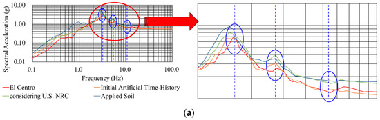 The artificial seismic load generated by SIMQKE—an artificial seismic load generation program—does not meet the criteria presented in the U.S. NRC standard. Lilhanand and Tseng [29] proposed a method of generating an artificial seismic load that is similar to the design response spectrum by applying a modification function, and verified that it affords sufficient reliability. Therefore, in this study, the seismic load generated in SIMQKE was modified using the modification function used in the prior study, and the modification function and modification time–history curve used in this study are as shown in Equations (1) and (2) and Figure 4.