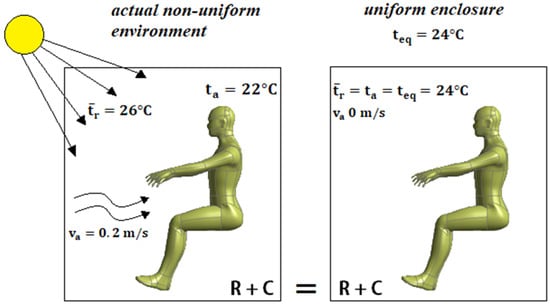 The definition of equivalent temperature is given in American ANSI/ASHRAE standard [] and in EN ISO14505 Part 2 [], which is a standard that is dedicated to the assessment of the thermal environment in vehicles. The definitions that are provided in [,] state that “equivalent temperature” represents the uniform temperature of an imaginary black enclosure in which an occupant would exchange the same amount of heat by radiation and convection as they would in an actual non-uniform environment (see Figure 1) []. In this case, the equivalent and the operative temperature use the same definition. They can both be expressed as an average between the values of the air temperature and the radiant mean temperature when they are weighted using the heat transfer coefficients (convection and radiation) that are between the occupant and the environment []. The relationship proposed by Madsen [] for the calculation of the equivalent temperature for air speeds bigger than 0.1 m/s is: