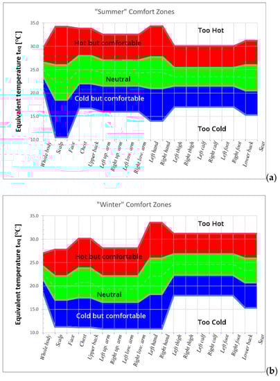 Comfort zones based on measured teq values in terms of subjective perception of conditions by vehicle occupants (after []): (a) summer case, (b)winter case.