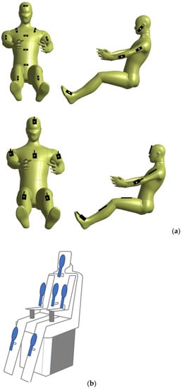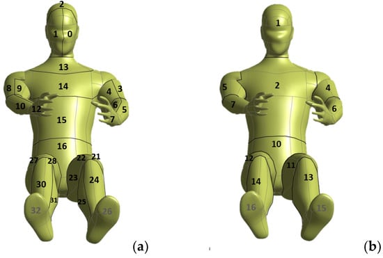 Two possible versions of manikins, as per EN ISO 14505/2—after []: (a) thermal manikin 33 zones, (b) thermal manikin 16 zones.
