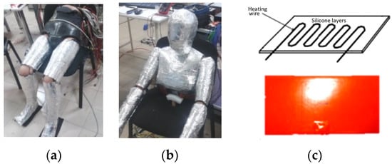 Figure 11 depicts the response of eight sensors to thermal behavior over time, both those with and without calibration. In order to avoid non-uniform temperature distribution [], the surface of the prototype was covered with an adhesive aluminum foil. The entire surface of the manikin was covered with a transparent adhesive film to facilitate further investigations with a thermal (IR) camera. Various tests determining HE validation were performed to study the surface temperature distribution for all anatomical areas.