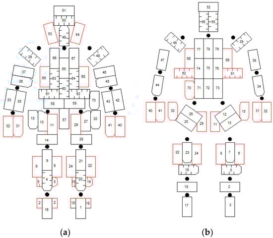 The upper and bottom body parts were tested, as seen in Figure 6a,b. Four different geometries of elementary flexible patches (Figure 6c) were chosen for the heating system (Figure 6d). The patches were manufactured by the Keenovo Company and consist of a thin layer of silicone (1.5 mm). They include a heating circuit made of nickel chrome heating wire, making them good electrical insulators and good thermal conductors. Of the many solutions that were tested, flexible heating silicone patches proved to be the best choice in ensuring good temperature distribution uniformity. Figure 7 presents the distribution of the HE on the corresponding anatomical areas. The surface of the thermal manikin is divided in 79 areas (or segments) and are intended to be controlled independently. The red drawings represent the zones on the opposite side of the manikin, and the black points illustrate joint points.