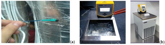 (a) TSic T501 sensors used to measure and control part of the thermal manikin. (b) Thermostatic Lauda Eco water bath with Lauda Eco Silver immersion thermostat—Photographs taken during calibration campaigns for the TSic sensors.