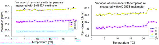 Variation in the resistance of several connected patches with the global temperature of the patch that was obtained after thermostatic bath essays.