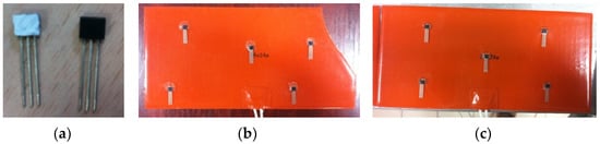 Distribution of the TSic T501 temperature sensors on the patches: (a) temperature sensors, (b,c) example of positions of the sensors on the patches.