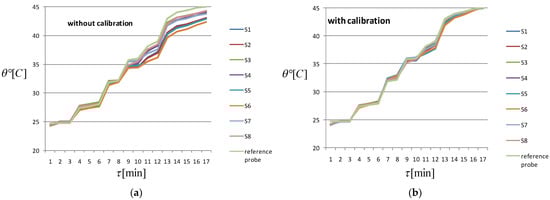 Response at thermal solicitations over time of TSic TO92 sensors: (a) without calibration, (b) with calibration.