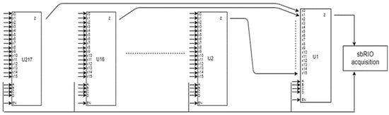 The architecture of the control system was designed by the Mechatronics Department of the National Institute of Aerospace Research (INCAS), and it was developed together with the team from the CAMBI Research Center. The proposed solution comprises two systems that were provided by National Instruments (NI) and is based on FPGA technology. The advantage of this solution compared to the use of the microcontrollers is that it represents a significant improvement in terms of its big data collection capacity (up to 400 channels, signal, filters, bias, etc.), with appropriate signal generation for all 80 channels being represented during the software implementation of the acquisition boards (16). Another advantage is the possibility of using sequential/parallel calculations for the signal generation for all 80 channels—Pulse Width Modulation (PWM) for the transistor, and MOS gates activation in accordance with the output of a neuro-fuzzy controller.