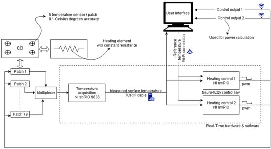 The FPGA software on the sbRIO 9636 board was used to acquire and record the signals from the multiplexer interface, which collects all of the inputs and separates them by shifting the register in the temperature data memory instead of by requesting one input at a time. The software from the myRIO 1900’s FPGA creates the Pulse Width Modulation that is used to control the patch surface. The acquisition device processes the data in order to obtain reliable mean temperatures for every patch from the five temperature sensors using a fault detection and an isolation algorithm. The heating control devices generate a robust and adequate response using the data that are processed by the acquisition board and the neuro-fuzzy controller. The real-time hardware and software can run independently from the user interface, with the limitation of maintaining the last (or default) requested temperature set point.