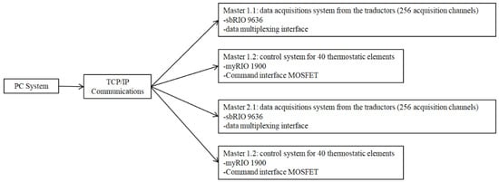 Two National Instruments boards (myRIO and sbRIO) were used. Each of them was provided with a sequential computing unit (×86) and a matrix computing unit (FPGA). In order to interconnect the boards with the temperature transducers, a multiplexing interface was developed using HEF 4067B circuits. An interface based on SN7407 circuits was achieved to control and to send commands to the MOS transistors that were used for the execution system. The basic architecture of the manikin system is presented in Figure 13, and the thermostatic system architecture is shown in Figure 14.