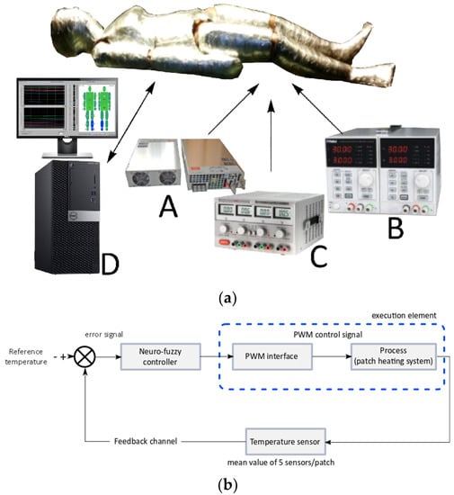 (a) Power supplies used for the manikin A—main power supply used for the heating patches; B—power supply used for myRIO boards; C—power supply used for sbRIO boards; D—computer used for manikin control and monitorization; (b) control system diagram for one control channel.
