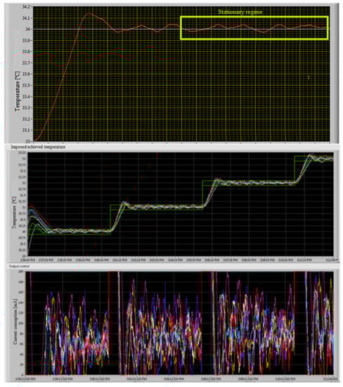 An example of such explorations is presented in Figure 18 and Figure 19. The top figure, Figure 18, shows how a manikin surface with an ambient temperature of 22 °C can reach the desired temperature of 34 °C in about 3 min, with the control system then working in steady regime. The figure below Figure 18 shows how thermoregulation is achieved on several levels of the desired temperature. One can also see the variation in the control in mA.