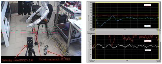 Tests for the temperature control of the thermal manikin using a regular fan (left). The behavior of thermoregulation system with neuro-fuzzy control when two zones (arm and forearm) are cooled with ambient temperature and at 0.8 m/s (right) (up—temperature, down—current consumption).