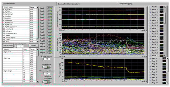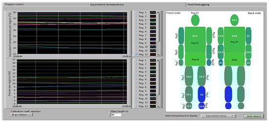The standard EN ISO 14505-2 [] proposes two temperature distribution variations on the surface of the manikin (see Figure 19 and Table 1). In the user interface, temperature set points can be imposed for each segment (see Figure 20). The bottom and the center graphs contain the variations in the power consumption per region, respectively, per patch for each 30 s interval. The real-time temperatures on the manikin regions are displayed in the top graph. One can see here that the control system is efficient in maintaining the desired temperature on each area within the required error ±0.1 °C for the temperatures that are similar to the human surface temperature.