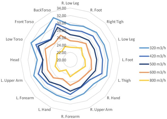 If we compare to the traditional measurement methods through which we can estimate the global PMV, the advantage of the thermal manikin is that it can assess thermal comfort at a local scale and can predict local sensations through the use of the equivalent temperature or through a local PMV that is based on the equivalent temperature instead of the air temperature and the operative temperature []. Thermal manikins constitute a powerful assessment tool for the evaluation of the thermal comfort analysis both for lab conditions and for real case studies. Additionally, through the evaluation of the local values of equivalent temperatures for different manikin body parts, local discomfort can be investigated. This method of representing the equivalent temperature enables, for example, the evaluation of the uniformity of the environmental parameters. In Figure 16, we can see one example of our measurements of equivalent temperature distributions in the climatic chamber that were obtained with the thermal manikin (Suzi) data for five air flow rates in the climatic chamber, which are represented using the method defined by Nilsson [,,] or by the standard EN ISO 14505/2 [].