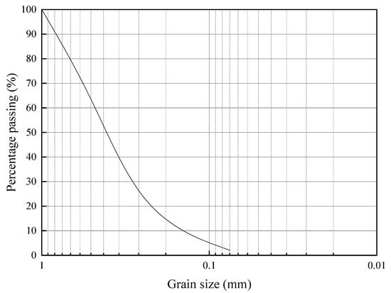 The calcareous sand of the foundation material used for this test model was taken from the South China Sea and consisted of uncemented loose coral debris sediments. Meanwhile, siliceous sand from the lower reaches of the Yangtze River was collected to perform a comparative test. To produce similar particle size curves for calcareous sand and siliceous sand, the foundation soils were prepared by controlling the parameters, such as the particle size distribution, water content, and density of the sand samples. According to the conclusion given by Craig et al. [], the ratio of the size of the model pile to the particle size of the soil in the model foundation is greater than 23 times, i.e., the influence on the static load test results of the pile foundation is negligible. In this test, a calcareous sand sample, with a particle size less than 1.0 mm, was selected. Calcareous sand materials with different particle sizes were obtained by a screening test. The unevenness coefficient and the curvature coefficient of calcareous sand and siliceous sand were 3.34 and 1.19, respectively, as calculated from the results of the screening test and mass percentage of the particle size in each range. Figure 1 shows the particle size distribution.