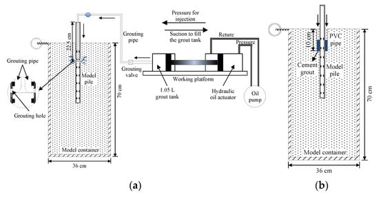Various grouting devices have been developed to satisfy the requirements of the post-grouting test. A grouting device mainly includes a hydraulic pump, a working platform, a storage tank, and a hydraulic oil actuator, as shown in Figure 2. Before the annular point grouting test, the homemade grouting device is adopted to inject water into the grouting tube to break the pushpin on the pile hole to ensure a smooth grouting pipeline; then, the prepared cement grout is stored in a 1.05 L grout tank after being transported through the grouting device. The grouting pipe is connected to the grouting pipe in the pile shaft by a three-way joint, and the hydraulic pump is used to adjust the pressure and rate of grouting. Cement grout is injected into the foundation soil to complete the annular point grouting test. The water-cement ratio of the cement grout prepared in this test is selected as 0.6. The hydraulic pump is employed to adjust the pressure and rate of grouting during the implementation process. During the whole grouting test of grout injected into two sand samples, the pressure fluctuates between 0.25 MPa and 0.3 MPa, and the injection volume of the cement grout is approximately 200 mL. The surface of the two foundation soils is uplifted, and the post-side-grouting test is completed.