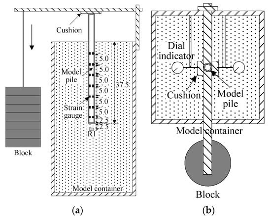 Static load test of a single pile and testing element arrangement (unit: cm): (a) front view; (b) vertical view.