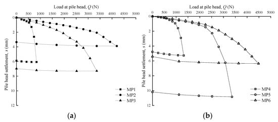 Figure 4 shows that the load-settlement curves of ungrouted piles have obvious inflections, and the load-settlement curves of grouted piles tend to be smoother than those of ungrouted piles. The load-settlement curve of each single pile is relatively gentle and approximately linear during the initial load increments. The settlement of a single pile gradually increases with applied load, and the load-settlement curve of a single pile presents an obvious nonlinearity. For the ungrouted piles, when the ultimate load is reached, the load-settlement curve sharply plunges, which represents penetration failure of the pile. For grouted piles MP2 and MP6, the bearing capacity of a single pile after grouting has been greatly improved so that it is loaded to the device limit without a distinct inflection. Prakash and Sharma [] and Li et al. [] proposed that the load prior to failure is determined to be the axial compressive bearing capacity of a single pile, while the maximum test load is taken to be the axial compressive bearing capacity of a single pile in the case of no obvious inflections. Therefore, the ultimate bearing capacities of single piles MP1, MP2 and MP3 are 735 N, 4200 N, and 3080 N, respectively. The ultimate bearing capacities of MP4, MP5 and MP6 are 1200 N, 3080 N, and 4480 N, respectively.