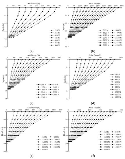 Measured axial force distributions for test piles at different loading levels: (a) MP1; (b) MP2; (c) MP3; (d) MP4; (e) MP5; (f) MP6.