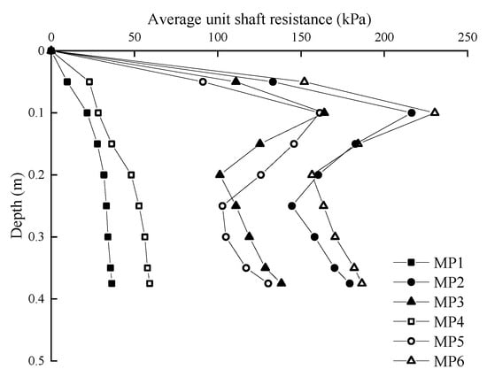 Figure 6 shows the distribution of the average unit shaft resistance of each single pile under ultimate loading. The shaft resistance is a process that gradually develops from the upper soil layer to the lower soil layer. For ungrouted piles, the shaft resistance of the pile gradually increases with the increase in buried depth when the load increases, while the grouted piles obviously increase the horizontal effective stress of the surrounding soil due to the grouting at the side of the pile, and the shaft resistance of the pile increases significantly; therefore, the extreme point of shaft resistance occurs approximately 0.1 m from the surface. Figure 6 shows that the average unit shaft resistances of single piles MP1, MP2, MP3, MP4, MP5, and MP6 under ultimate loads are 28.23 kPa, 167.33 kPa, 123.87 kPa, 44.26 kPa, 121.86 kPa, and 177.65 kPa, respectively. The shaft resistance of the ungrouted pile in calcareous sand is less than that in siliceous sand, which is mainly caused by the decrease in shaft resistance due to the particle breakage of calcareous sand during pile driving. In addition, compared with that of the ungrouted pile, the shaft resistance of the grouted pile improves substantially, which indicates that the injected cement grout effectively improves the physical and mechanical properties of the undisturbed surrounding soil. In addition, the effective stress of the soil around the pile increases, thereby enhancing the strength of the surrounding soil. After grouting at the side of the pile, the cement grout and calcareous sand particles condense to form stable cement-stabilized soil; therefore, the pile-soil interaction system forms a new structure, which greatly increases the shaft resistance of a single pile in calcareous sand, and the mobilization of side friction in calcareous sand basically demonstrates identical characteristics as those of side friction in siliceous sand.