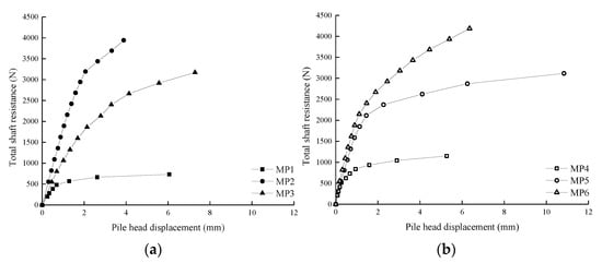 Total shaft resistance versus pile head displacement curves of each pile: (a) calcareous sand; (b) siliceous sand.