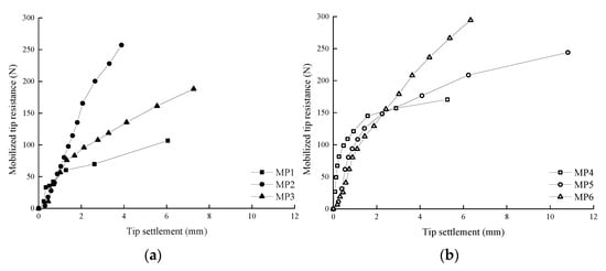 Figure 8 shows the relationship between tip resistance and tip settlement for each pile, in two types of sandy soil. Figure 8 shows that the tip resistance of a single pile varies with the change in tip displacement. The pile tip resistance increases rapidly with the displacement of the pile tip during the initial loading stage. With increasing load, the pile tip resistance gradually mobilizes. After reaching the ultimate load, the grouted pile has a larger tip resistance than the ungrouted pile because of the strengthening effect of the grouted lateral soil strength on the tip resistance of the pile. Thus, the tip resistance can also be improved by the enhancement in the surrounding soil, due to side grouting. In addition, the curves of the tip resistance versus the tip settlement show hardening characteristics after exceeding the ultimate load. The literature [,,] also reported the hardening phenomenon of pile tip resistance in fine sand and calcareous sand after reaching the ultimate load.