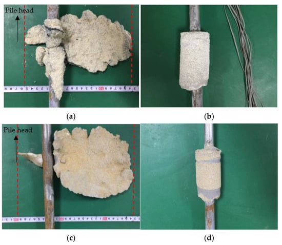 To observe the infiltration and expansion of the injected grout in the model foundation, the sand samples in the model container were excavated after the static load test was completed. For the annular point grouted pile, the cement grout migrates upward along the pile shaft and diffuses horizontally during the excavation process, forming a stable structure of cement-stabilized soil with the foundation soil. For the ideal-geometry grouted pile, the cement grout poured into the PVC pipe forms a cement-stabilized mass of the same size as the PVC pipe, and the cement-stabilized mass is fastened to the pile shaft. Its surface condenses with the sand sample to form a new structure, so the interaction among the pile, soil, and grout enters a new structural equilibrium state.