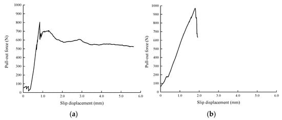 To evaluate the bond strength between the cement grout pressed into the side of the pile and the pile shaft, the two ends of the cement-stabilized mass of the ideal-geometry grouted pile were ground flat, and a pull-out test was conducted to detect the shear strength between the cement-stabilized mass and the pile shaft. The pull-out force-slip curves, between the cement-stabilized mass and the pile shaft in calcareous sand and siliceous sand, obtained in this test are shown in Figure 10.