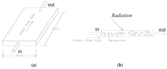 The modeling of a direct absorption solar collector, such as the one shown in Figure 1 was carried out as in [,]. In the figure, the direction of the fluid flow, the incident solar radiation and the proportional relationship between the dimensions of the solar collector are indicated.