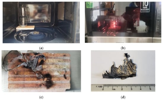 The C60 molecules used in the present work were produced by the microwave synthesis method described in Mattínez-Reyes []. The fabrication was carried out in a conventional SAMSUNG microwave oven with a frequency of 2450 MHz, a wavelength of 12 cm and a maximum power of 1480 W. Prior to the synthesis, the temperature profiles of the oven were evaluated, for which the turntable was removed from the microwave to establish its maximum temperature points. Subsequently, in one of these high temperature points, 250 mg of terpenoid resin (commercial camphor C10H16O) was introduced in a glass reactor with a capacity of 113 mL and placed inside the oven with a heating time of 5 min, as observed in Figure 5a). In the heating process, the resin decomposes, forming a plasma that is visible by the emission of a very bright light (Figure 5b). When the decomposition process ends and the plasma disappears in the upper part of the glass reactor, a silver-gray layer and a characteristic soot of the formation of macromolecules are observed (Figure 5c,d).