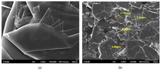 The morphology of the surface of the film and the thickness of the samples were characterized by High-Resolution Transmission Electron Microscopy, HRTEM (Figure 6) in a DUAL BEAM SEM/FIB equipment, Nova Nanolab200 from FEI Company, with a resolution of 2 nm at a working distance of 5.0 mm. The voltage used to analyze the sample was in the range of 18 to 25 kV with a current of 15 nA. The elemental chemical analysis of the sample was performed by Energy Dispersive X-rays (EDS) and is shown in Table 2. The film observed in Figure 6a,b consists of a series of layers stacked one on top of the other, identifying a continuous surface with randomly distributed film fragments as shown in Figure 6a. The thickness of the carbon film is variable with a range from 140.8 to 523.3 nm, Figure 6b. In addition, the thickness of the film is made up of thin intercalated layers in the form of a stack, with a range from 40.6 to 686.5 nm.