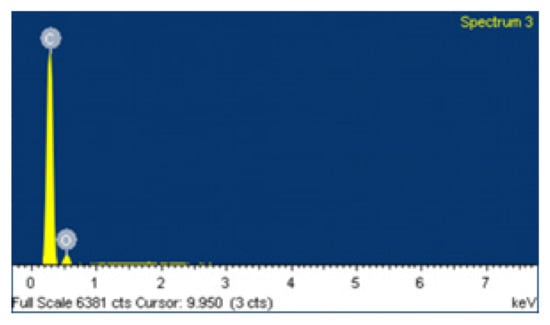 The chemical analysis performed on the samples was carried out by dispersive X-ray spectroscopy, whose spectrum is observed in Figure 7, and from which the elements that make up these thin films were quantified. Table 2 shows that the majority of the material is composed of carbon and shows slight oxidation.