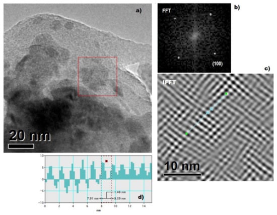 High-resolution transmission micrograph seen in an HRTEM. (a) Bright field, (b) Fast Fourier Transform (FFT), (c) Inverse Fourier Transform, (d) interplanar distance measurement.