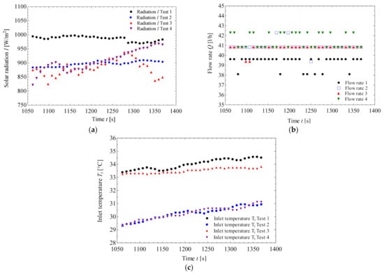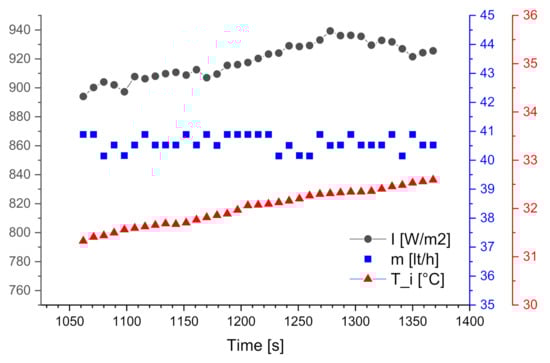 In the measurements made in this work, the solar radiation meter used only measures direct radiation, which means that it provides minimum values when the sun is obstructed by a cloud, for example. This causes the measured radiation values to vary between 100 W/m2 and 1200 W/m2 in a few seconds. To solve this problem, between 3 to 5 measurements were made for each established volumetric flow, at the same time of the day and during days in summer and autumn that normally have close radiation values. Once such considerations were made and the measurements were performed, values of each variable were extracted during an interval of approximately 5 min and in which both the radiation and the volumetric flow were kept constant (Figure 12). The temperatures normally increased, however, and for the analysis, an average of each variable was used.