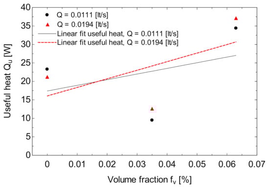 This section describes the results obtained from the different tests carried out throughout this research. The experimental and analytical results of the nanofluid samples, using an LTSC, are presented. Thirty-four tests were carried out, varying the volumetric flow: 0.0111 LT/s, 0.0166 LT/s and 0.0194 LT/s. Two different samples of nanofluids, with concentrations of 0.035% and 0.063% were made. The tests were carried out during the summer and fall of the year 2019, from 12 a.m. to 3 p.m., in intervals of 5 min per trial, performing three to five measurements for each volumetric flow and volume fraction, throughout the week, observing constant radiation. This has been made with the aim to compare using radiation values as similar as possible. Figure 14 shows the useful heat results of the LTSC, with two different concentrations compared to the base fluid. From the figure, it can be seen that at 0.035%, the heat produced by the collector is less than that of the base fluid. This may be because, at low concentrations, nanoparticles not only absorb energy, but also emit heat. From the same figure, it can be seen that at 0.063% concentration, the useful heat of the LTSC increases up to 47.22% with the flow of 0.0194 LT/s. The decrease in useful heat at a low concentration can be explained because the flow regime, represented by the Reynolds number (Re), is lower, which indicates that the effect of viscous forces predominates as the volumetric flow approaches zero and, therefore, less heat exchange is generated between the receiving tube and the flow.